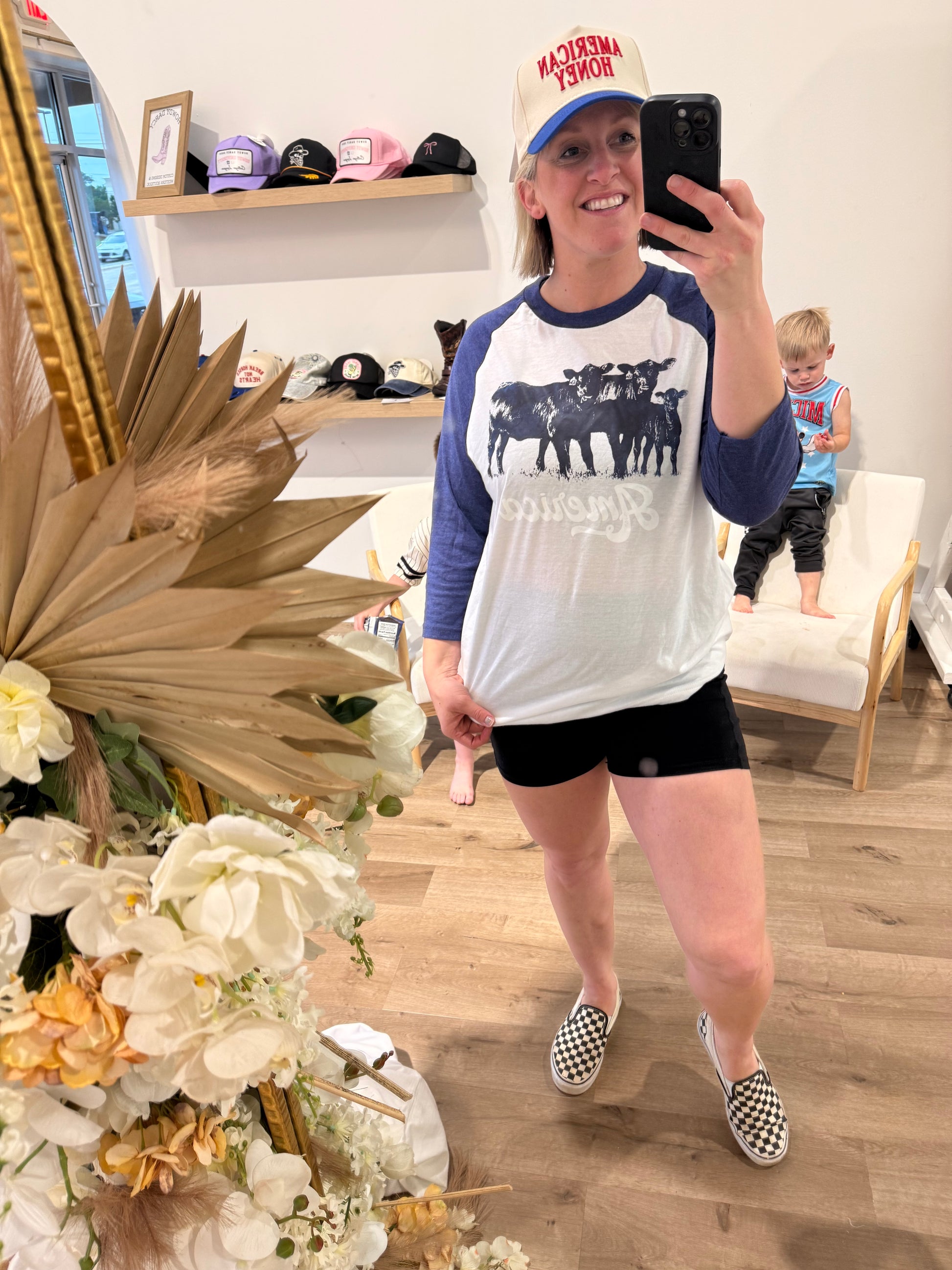 Our America Cow Raglan Tee brings the farm charm to your patriotic fits! Featuring navy 3/4 sleeves, a classic white body, and the cutest cow trio proudly repping the red, white, and moo—this tee is perfect for rodeos, cookouts, and Fourth of July fun. Soft, lightweight, and easy to style with denim or cutoffs, it’s the down-home way to show your love for the USA.