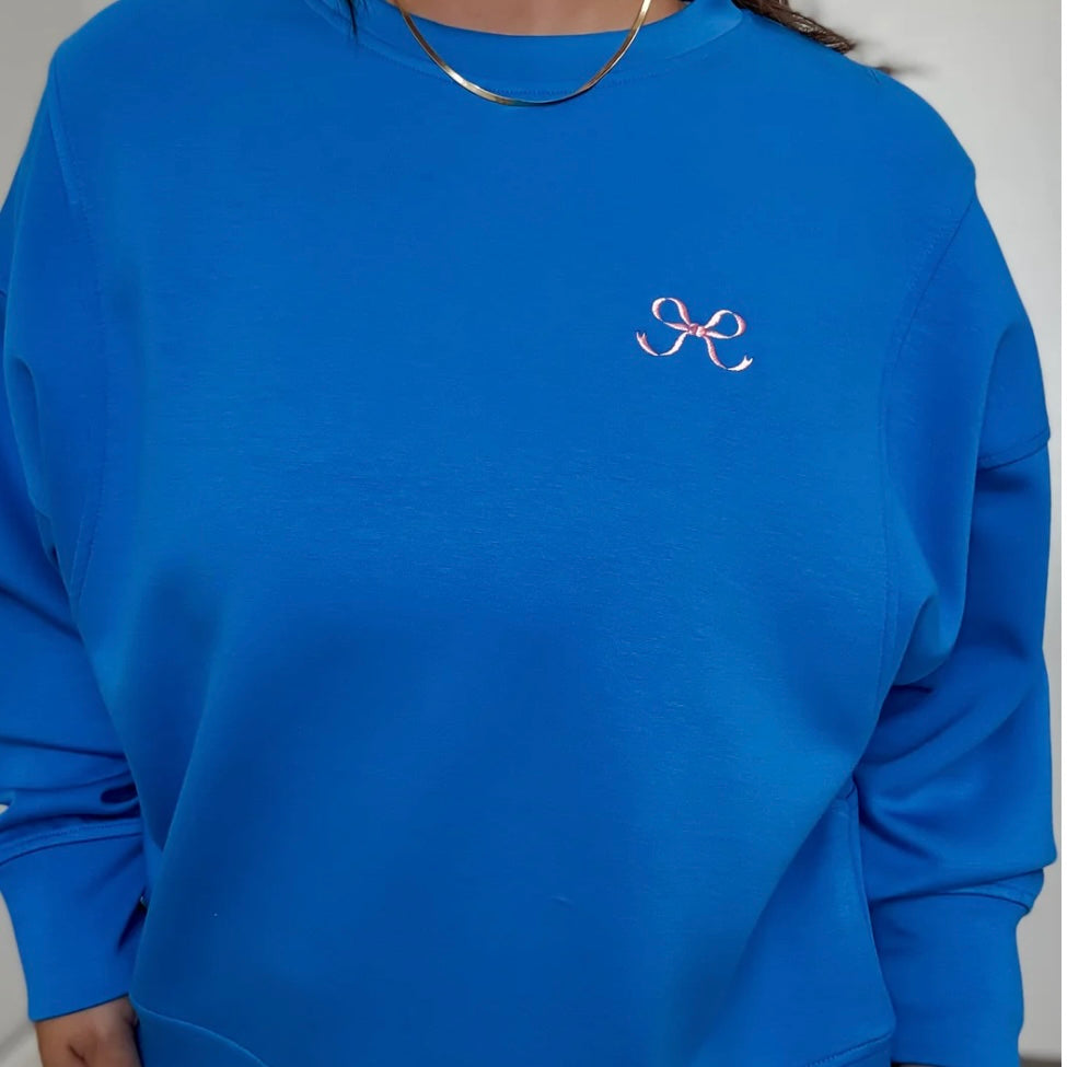 The BIRDIE Pink Bow Embroidered Marine Scuba Pullover blends sweet and sporty style, featuring a deep marine blue base accented with delicate pink bow embroidery. Crafted from smooth scuba fabric, this pullover offers a structured yet cozy fit, making it a standout piece for everyday layering.