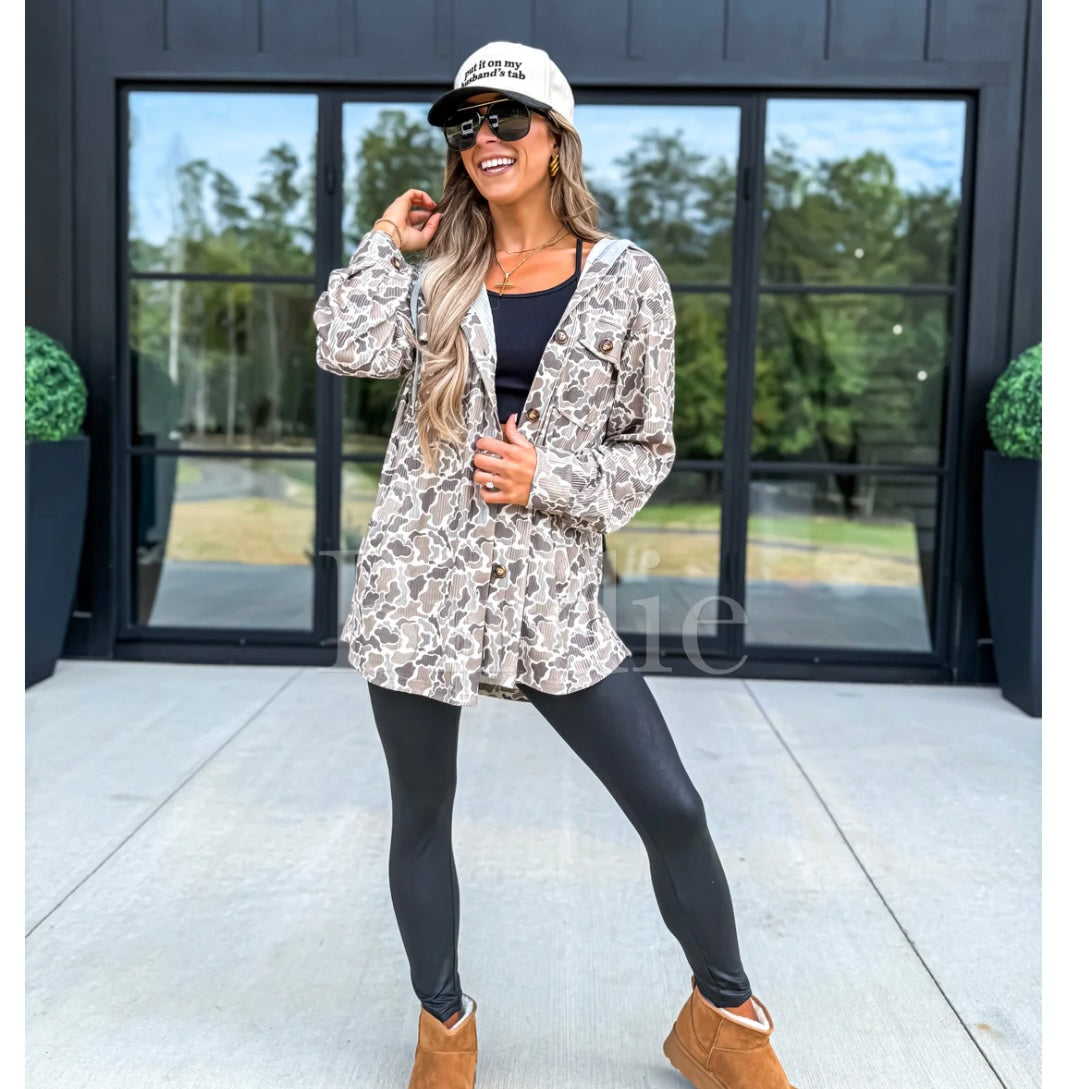 BIRDIE PREORDER Ribbed Shacket with Gray Hood in Duck Camo