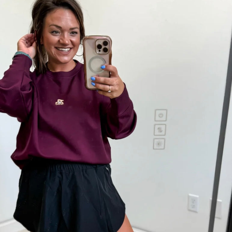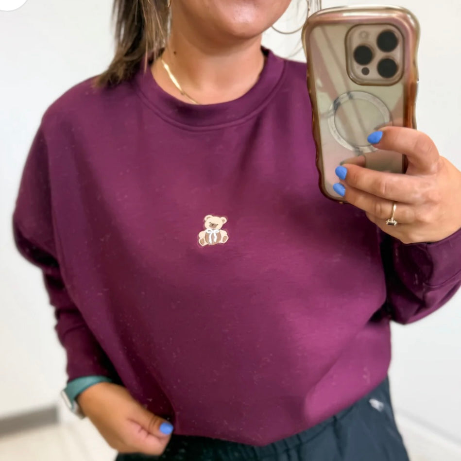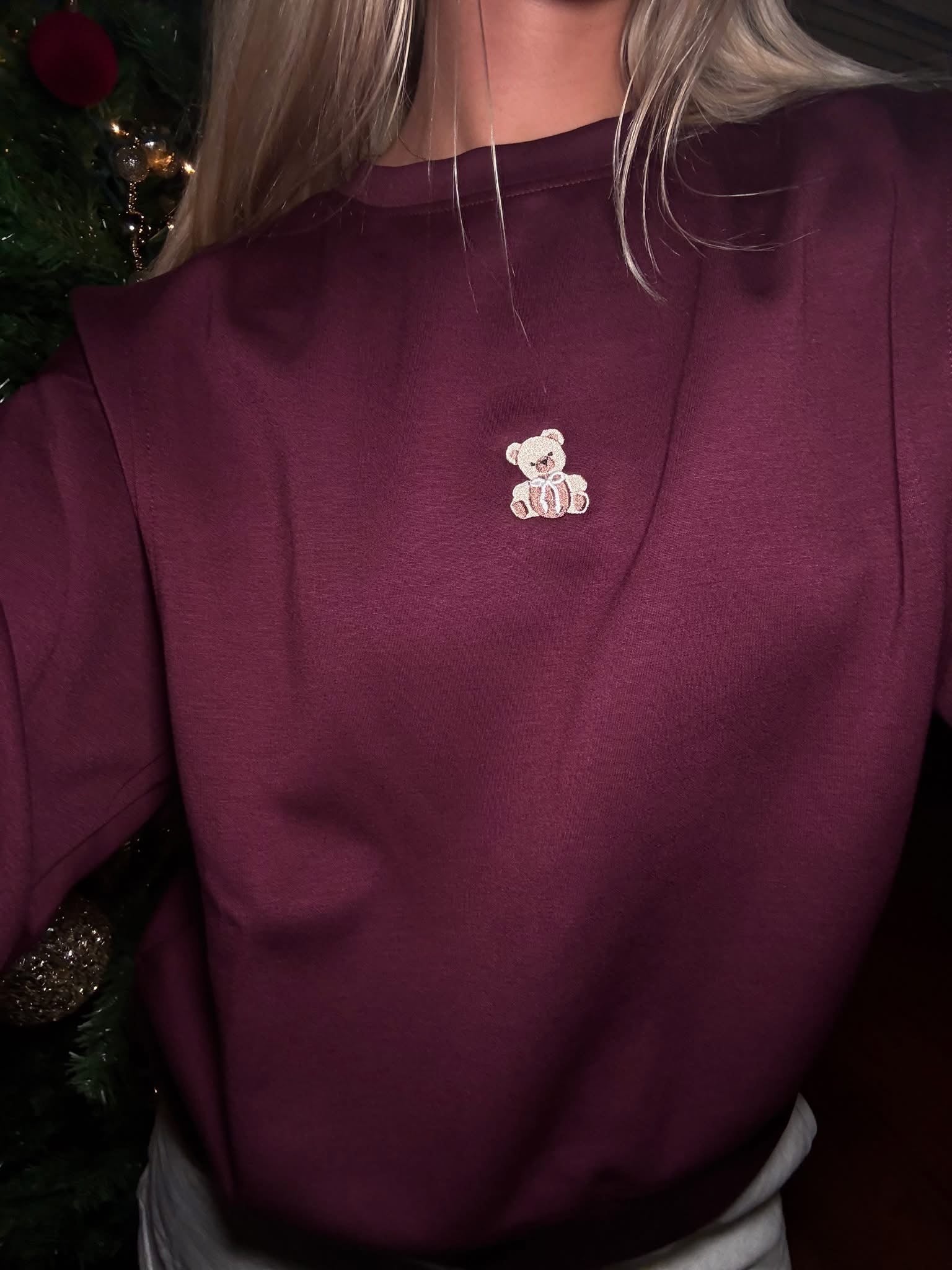 BIRDIE Teddy Bear Embroidered Maroon Scuba Hoodie-ready to ship