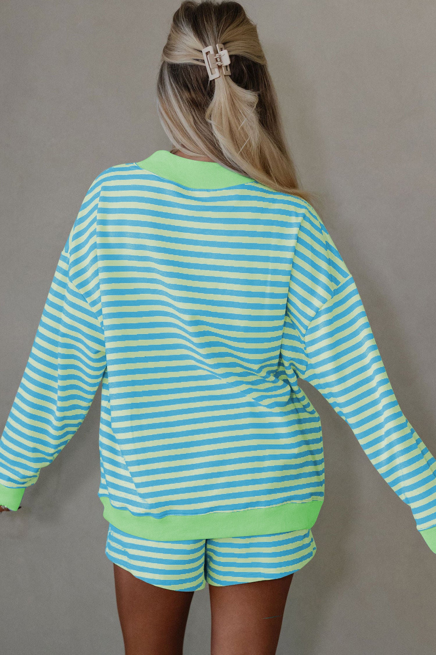 Green Stripe Color Block Detail Long Sleeve Pullover Elastic Waist Pull On Shorts 2pcs Set