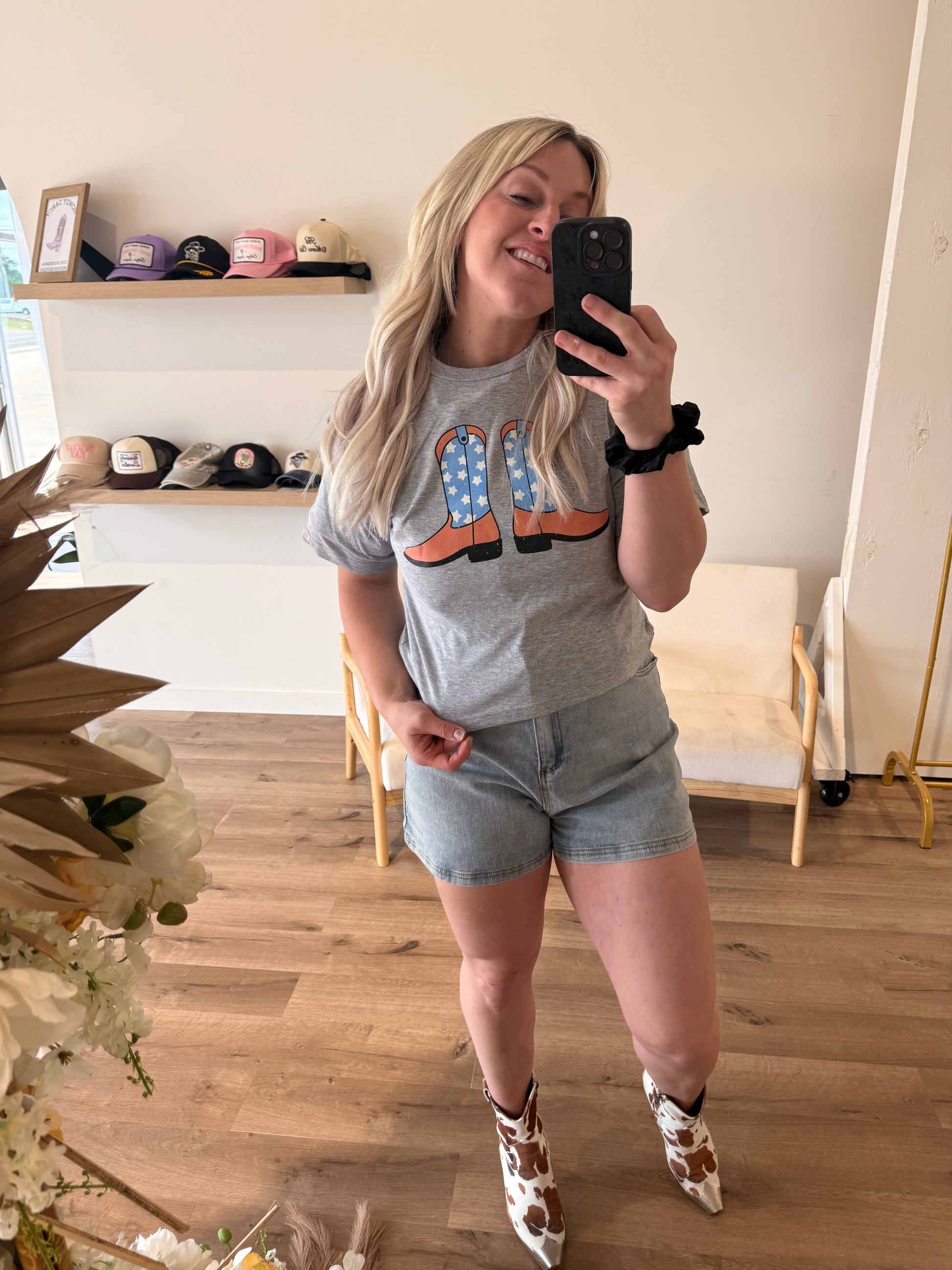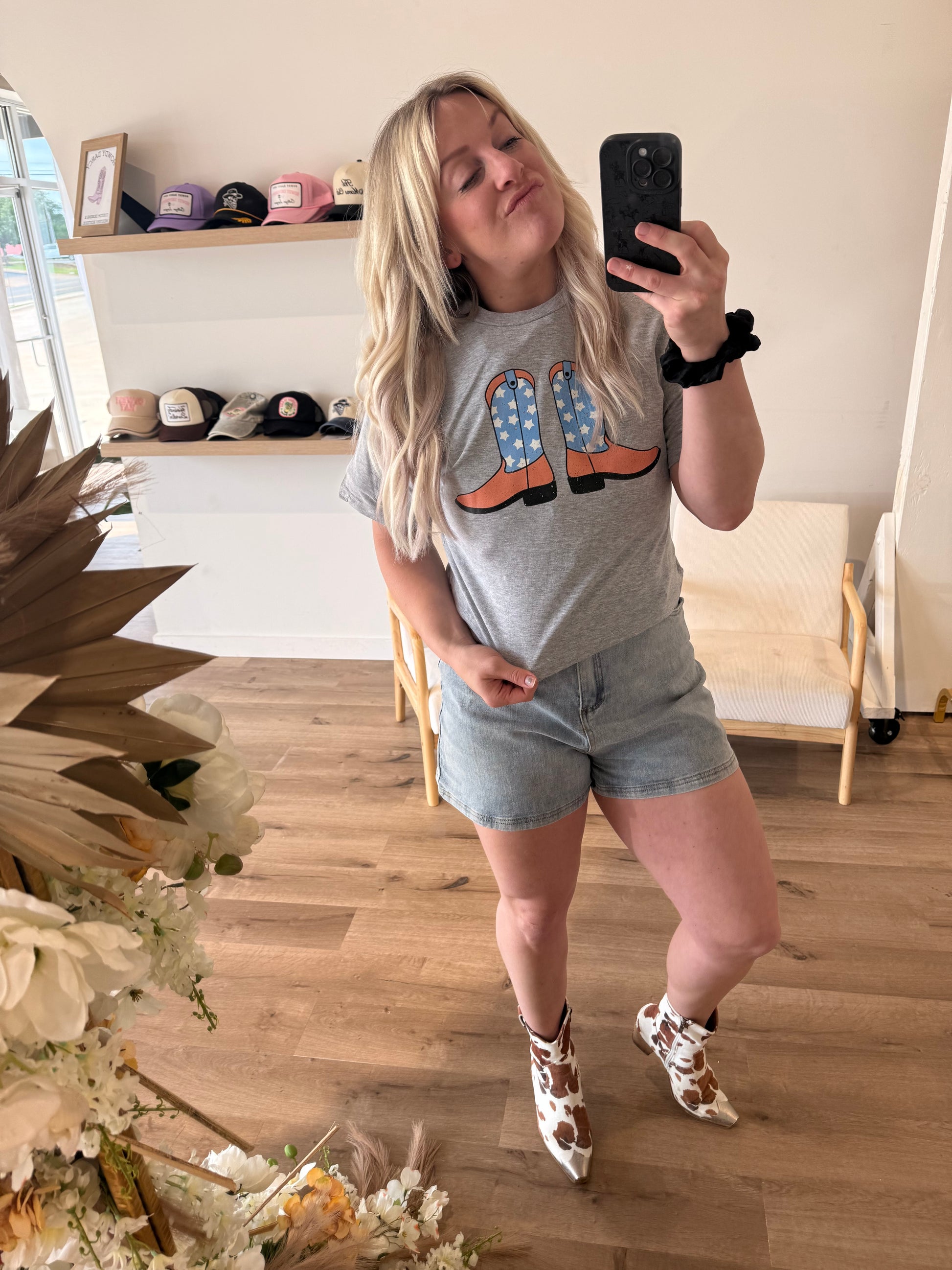 Our Star-Spangled Boots Crop Tee is the ultimate summer staple with a little southern sass. This soft gray crop features a bold graphic of red, white, and blue cowboy boots, sprinkled with stars and ready to stomp through parades, concerts, or your next backyard bash. With a comfy, flattering fit and a whole lot of attitude, it’s made for the all-American cowgirl who loves to show off her style.